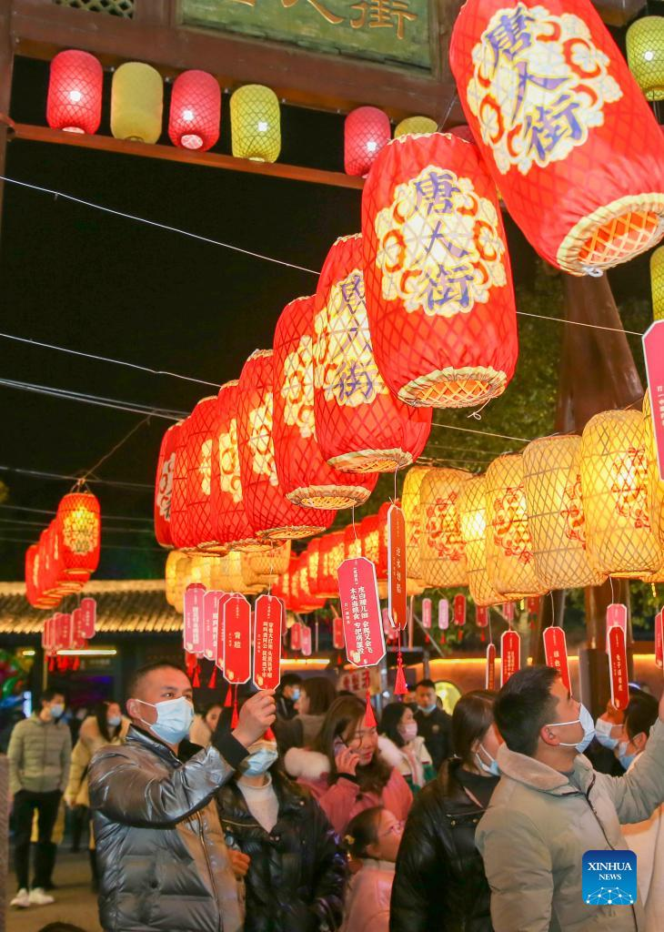 Citizens participate in a riddle-guessing event in Xiangyang, central China's Hubei Province, Feb. 9, 2022. Various events are held across China to celebrate the upcoming Lantern Festival. (Photo by Yang Dong/Xinhua)