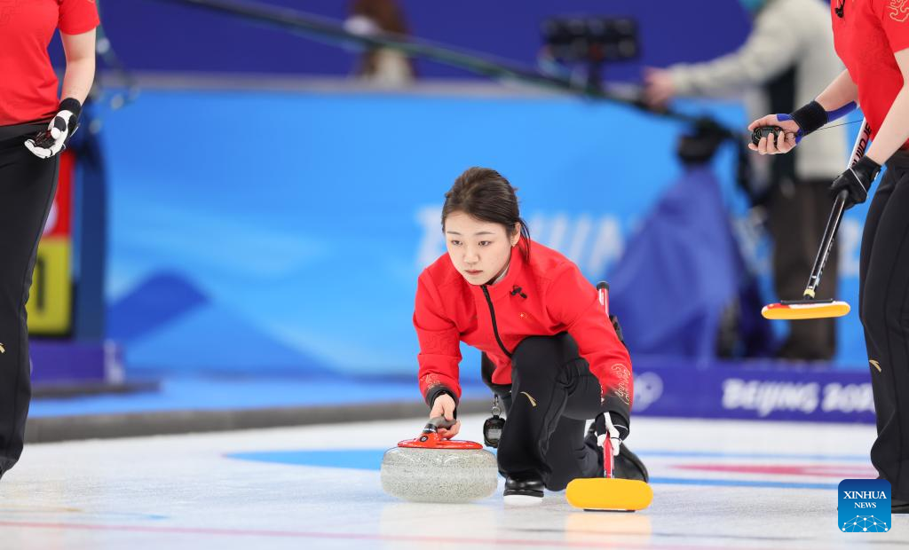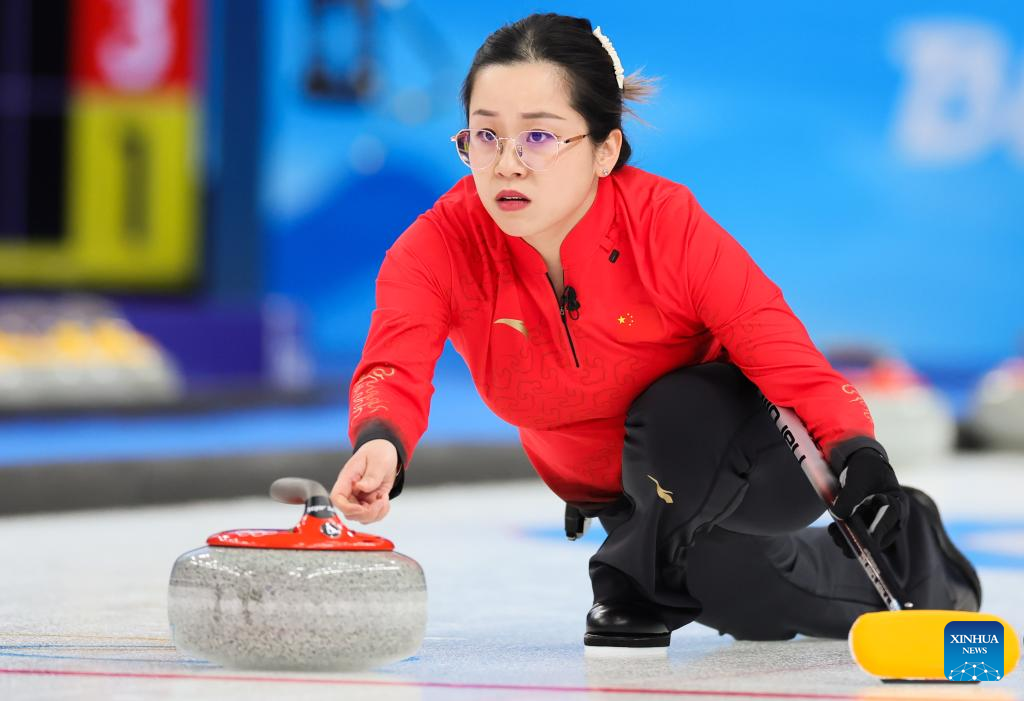 Dong Ziqi of China competes during the Curling Women's Round Robin Session 2 of the Beijing 2022 Winter Olympics between China and Switzerland at the National Aquatics Centre in Beijing, capital of China, Feb. 10, 2022. (Xinhua/Lan Hongguang)