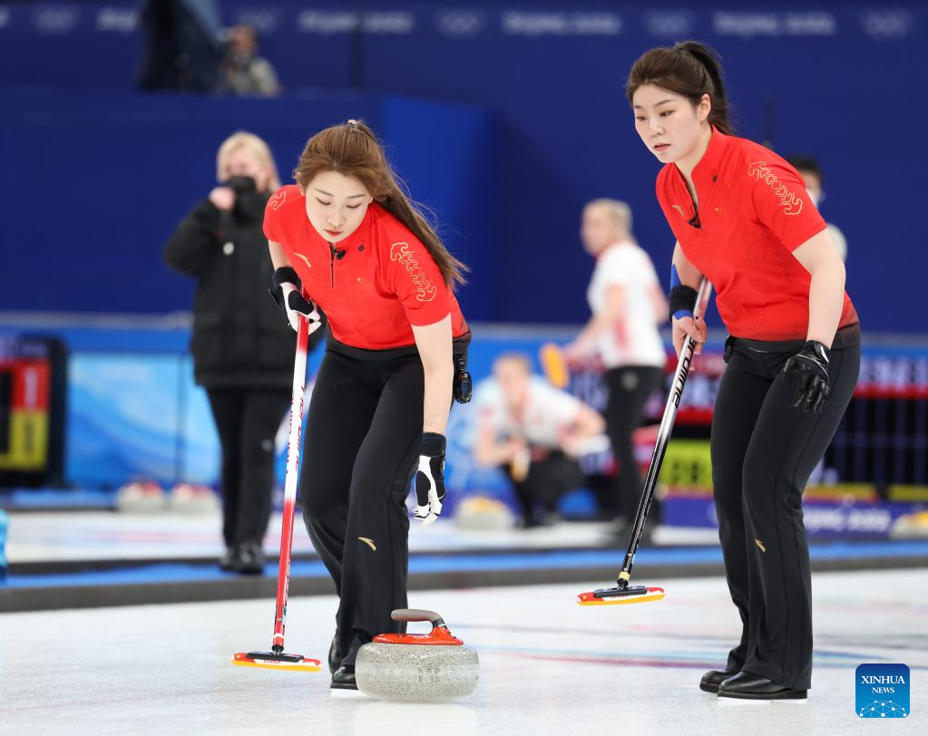 Dong Ziqi (L) of China and her teammate Zhang Lijun of China compete during the Curling Women's Round Robin Session 2 of the Beijing 2022 Winter Olympics between China and Switzerland at the National Aquatics Centre in Beijing, capital of China, Feb. 10, 2022. (Xinhua/Lan Hongguang)