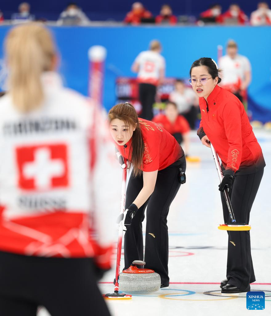 Alina Paetz (R) of Switzerland competes during the Curling Women's Round Robin Session 2 of the Beijing 2022 Winter Olympics between China and Switzerland at the National Aquatics Centre in Beijing, capital of China, Feb. 10, 2022. (Xinhua/Lan Hongguang)