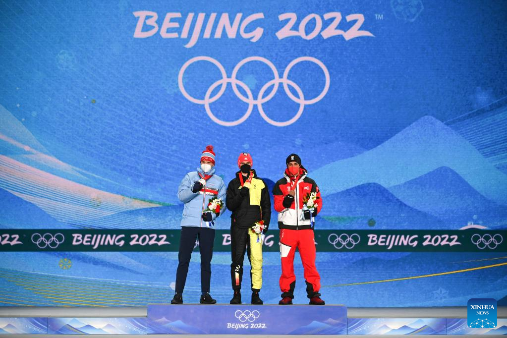 Gold medalist Vinzenz Geiger (C) of Germany, silver medalist Joergen Graabak (L) of Norway and bronze medalist Lukas Greiderer of Austria pose during the awarding ceremony of Nordic Combined Individual Gundersen Normal Hill/10km at Zhangjiakou Medals Plaza of the Winter Olympics in Zhangjiakou, north China's Hebei Province, Feb. 10, 2022. (Xinhua/Feng Kaihua)