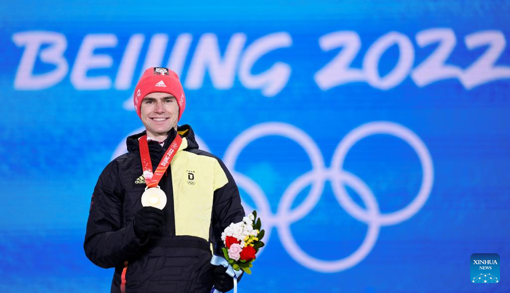 Gold medalist Vinzenz Geiger of Germany poses during the awarding ceremony of Nordic Combined Individual Gundersen Normal Hill/10km at Zhangjiakou Medals Plaza of the Winter Olympics in Zhangjiakou, north China's Hebei Province, Feb. 10, 2022. (Xinhua/Dai Tianfang)