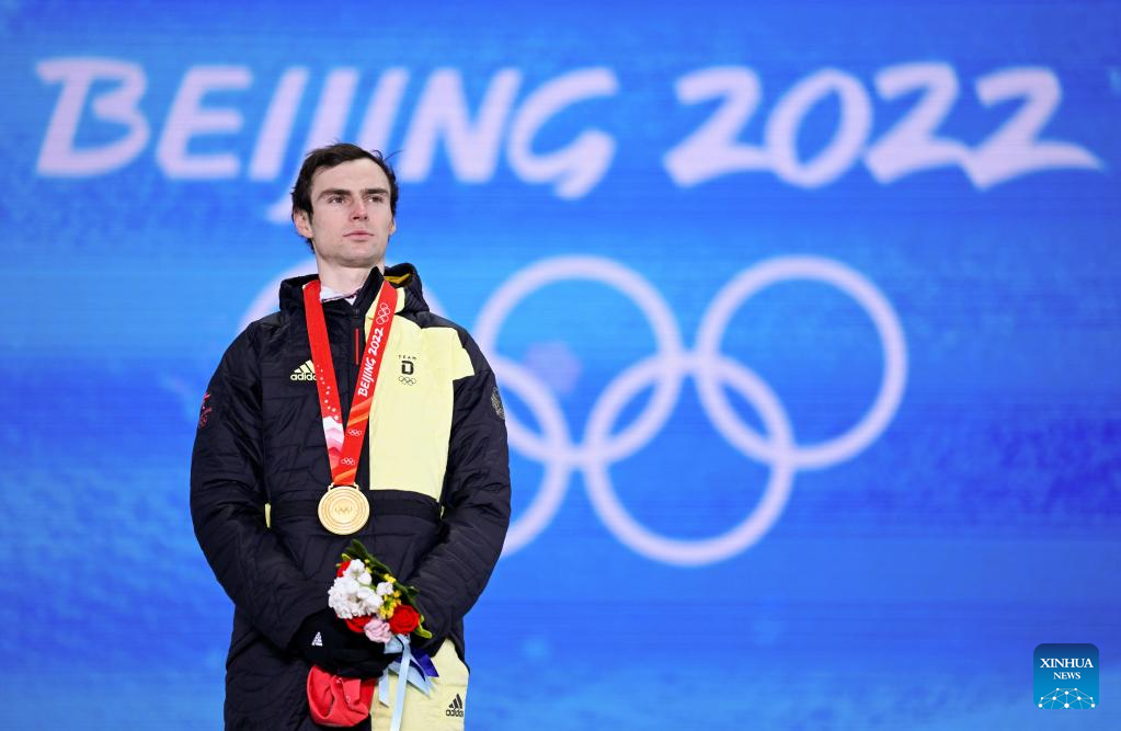 Gold medalist Vinzenz Geiger of Germany reacts during the awarding ceremony of Nordic Combined Individual Gundersen Normal Hill/10km at Zhangjiakou Medals Plaza of the Winter Olympics in Zhangjiakou, north China's Hebei Province, Feb. 10, 2022. (Xinhua/Dai Tianfang)