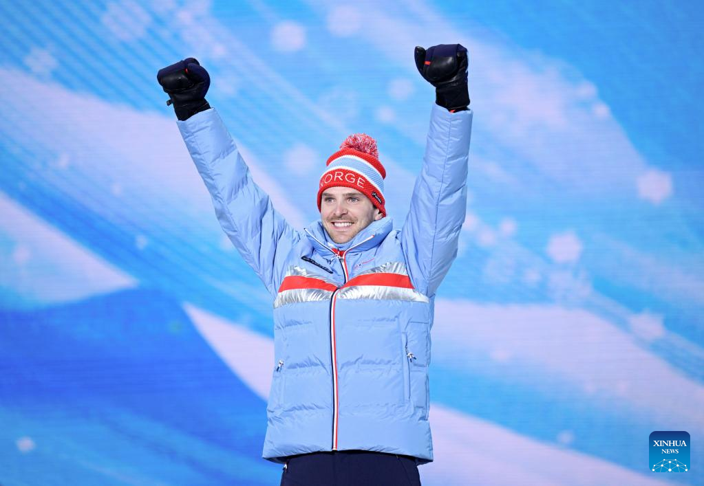 Silver medalist Joergen Graabak of Norway reacts during the awarding ceremony of Nordic Combined Individual Gundersen Normal Hill/10km at Zhangjiakou Medals Plaza of the Winter Olympics in Zhangjiakou, north China's Hebei Province, Feb. 10, 2022. (Xinhua/Dai Tianfang)