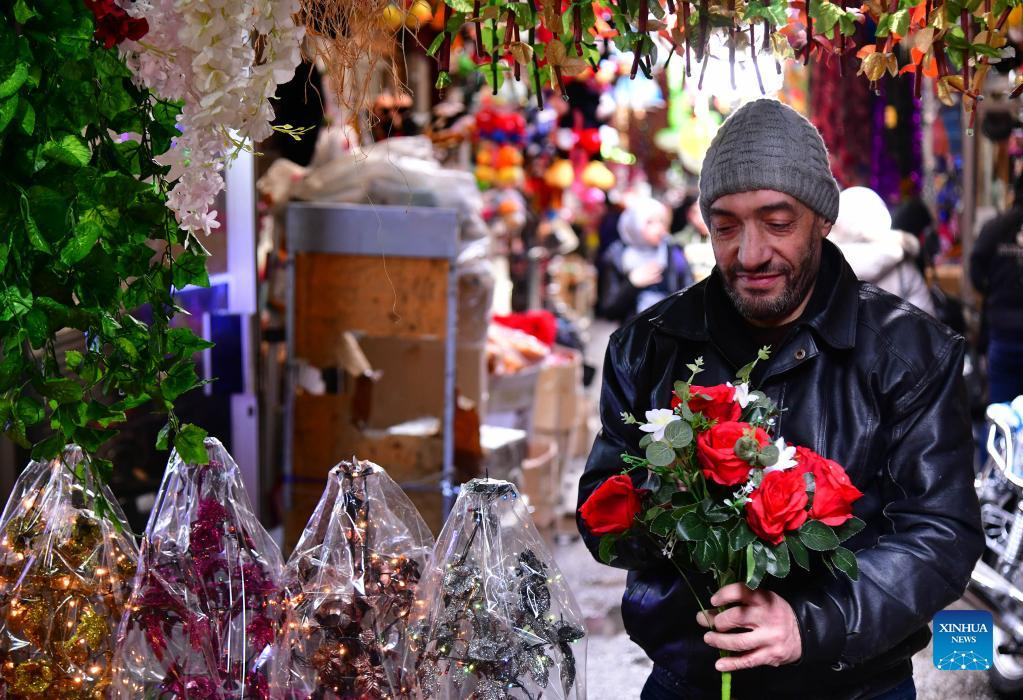 A shopkeeper makes preparation for the upcoming Valentine's Day in Damascus, Syria on Feb. 10, 2022. (Photo by Ammar Safarjalani/Xinhua)