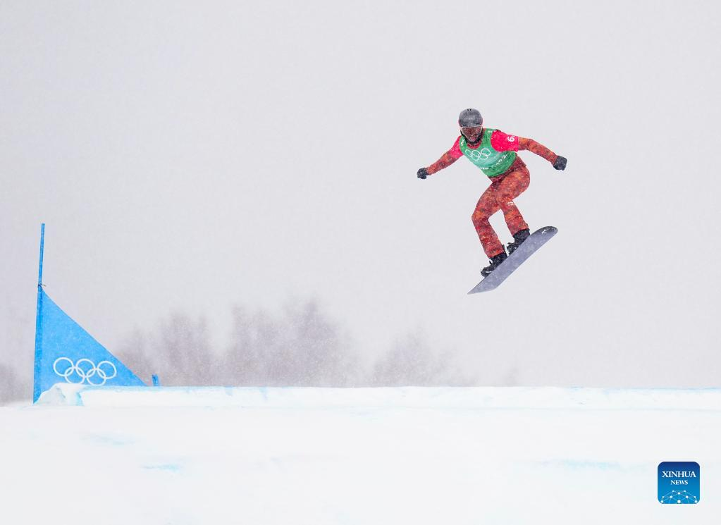 Eliot Grondin of Canada competes during the mixed team snowboard cross quaterfinals at Genting Snow Park in Zhangjiakou, north China's Hebei Province, Feb. 12, 2022. (Xinhua/Xu Chang)