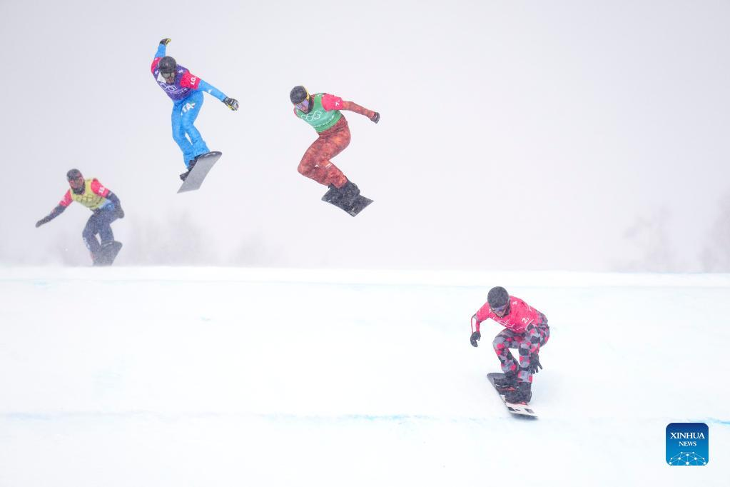 (R to L) Alessandro Haemmerle of Austria, Liam Moffatt of Canada, Lorenzo Sommariva of Italy and Huw Nightingale of Great Britain compete during the mixed team snowboard cross quaterfinals at Genting Snow Park in Zhangjiakou, north China's Hebei Province, Feb. 12, 2022. (Xinhua/Xu Chang)