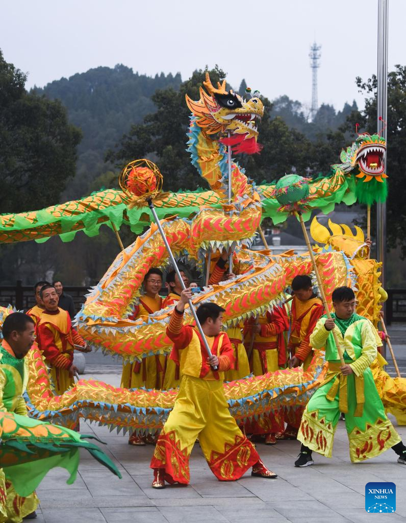 People perform dragon dance to celebrate the upcoming Lantern Festival in the ancient town of Shouchang in Jiande, east China's Zhejiang Province, Feb. 14, 2022. (Xinhua/Xu Yu)