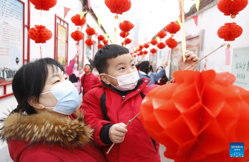 Children make Tiger lanterns at a community to celebrate the upcoming Lantern Festival in Wenzhou, east China's Zhejiang Province, Feb. 14, 2022. The Lantern Festival, the 15th day of the first month of the Chinese lunar calendar, falls on Feb. 15 this year. (Photo by Su Qiaojiang/Xinhua)