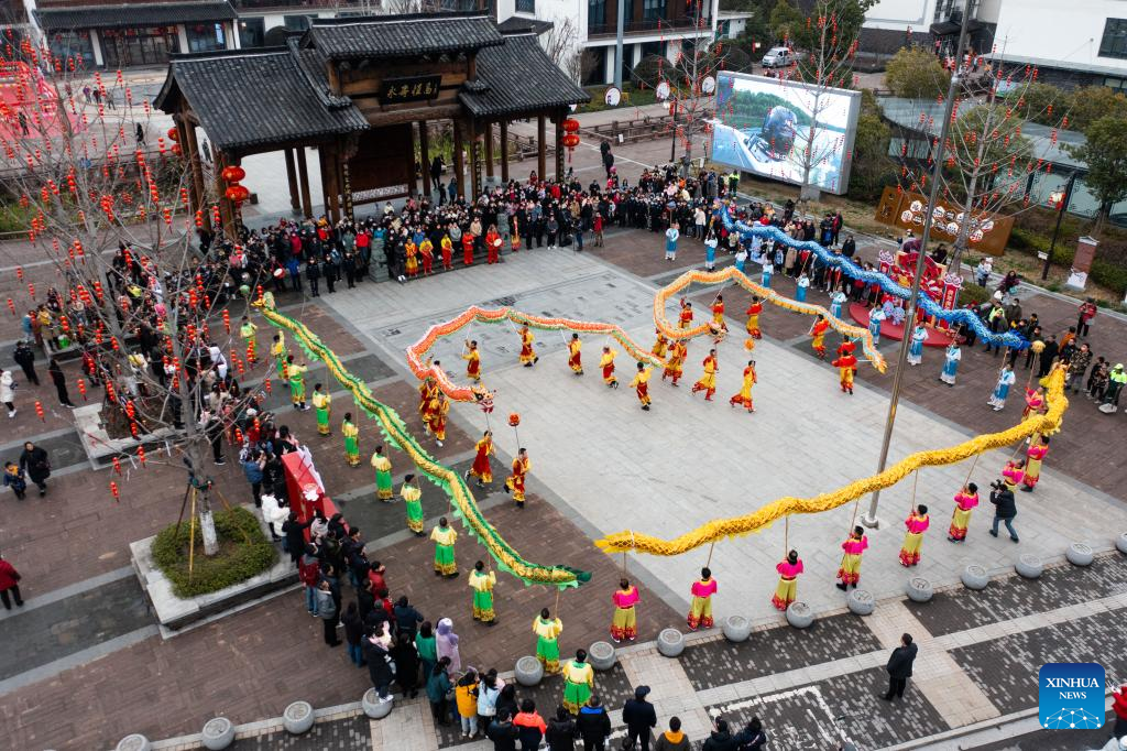 Aerial photo taken on Feb. 14, 2022 shows people watching dragon dance to celebrate the upcoming Lantern Festival in the ancient town of Shouchang in Jiande, east China's Zhejiang Province. (Xinhua/Xu Yu)
