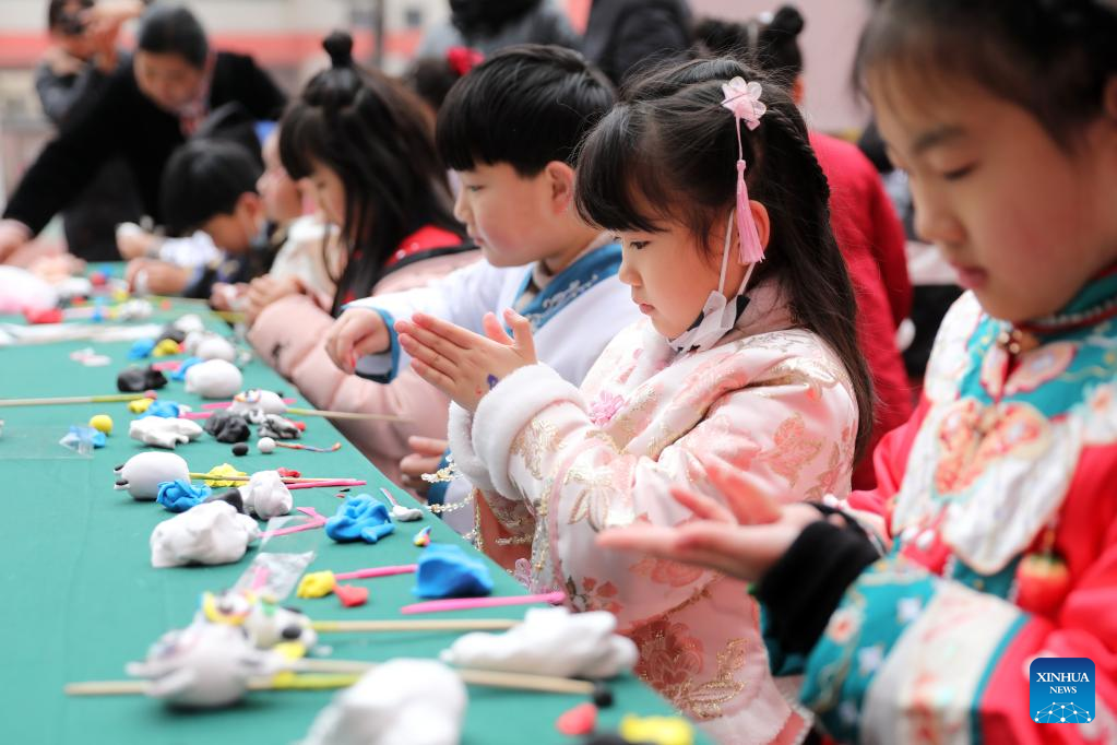 Students in traditional clothing learn to make dough figurines at an elementary school to celebrate the upcoming Lantern Festival in Huaibei, east China's Anhui Province, Feb. 14, 2022. The Lantern Festival, the 15th day of the first month of the Chinese lunar calendar, falls on Feb. 15 this year. (Photo by Wan Shanchao/Xinhua)