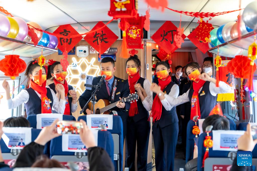Crew members perform for passengers on a train to celebrate the upcoming Lantern Festival, Feb. 14, 2022. The Lantern Festival, the 15th day of the first month of the Chinese lunar calendar, falls on Feb. 15 this year. (Photo by Han Qingxiao/Xinhua)