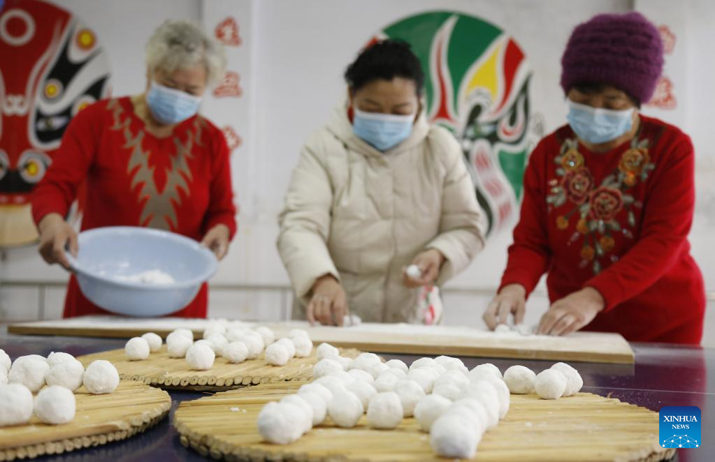 Residents make Yuanxiao, boiled glutinous rice flour balls typically consumed during the Lantern Festival, in Xingtai, north China's Hebei Province, Feb. 14, 2022. The Lantern Festival, the 15th day of the first month of the Chinese lunar calendar, falls on Feb. 15 this year. (Photo by Zhang Chi/Xinhua)