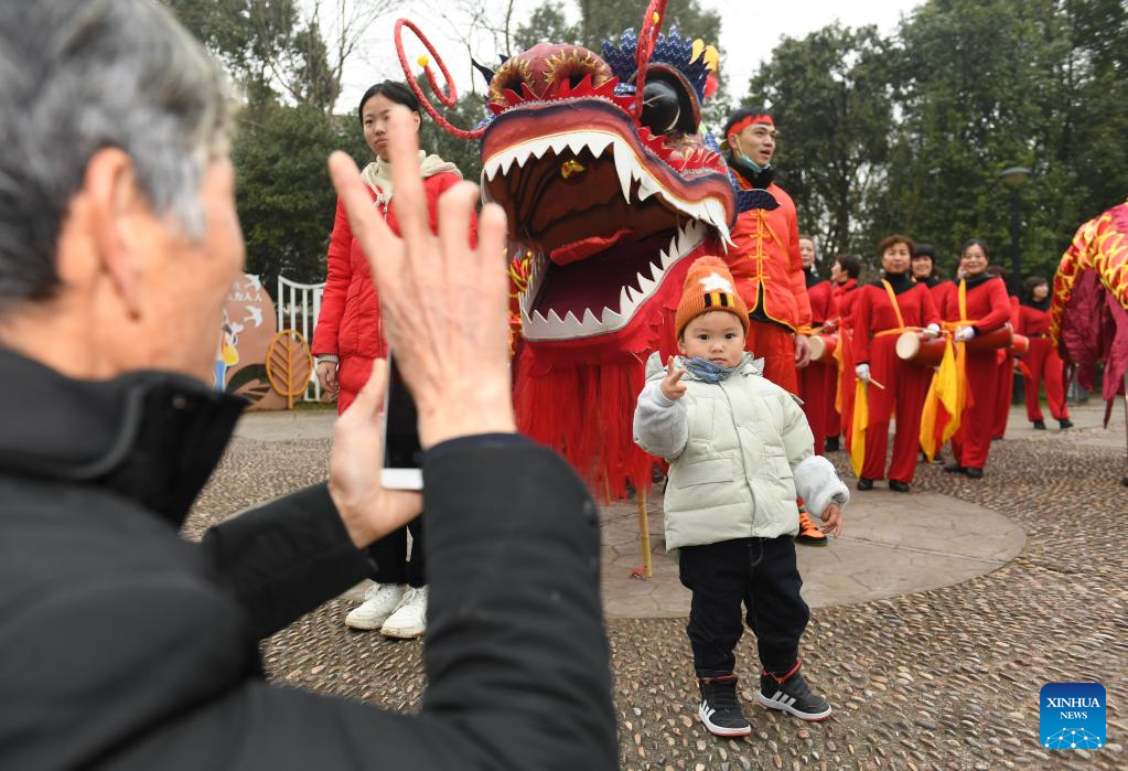 A child poses for photos with dragon dance performers, in Huzhou, east China's Zhejiang Province, Feb. 15, 2022. The Lantern Festival, the 15th day of the first month of the Chinese lunar calendar, falls on Feb. 15 this year. (Xinhua/Weng Xinyang)