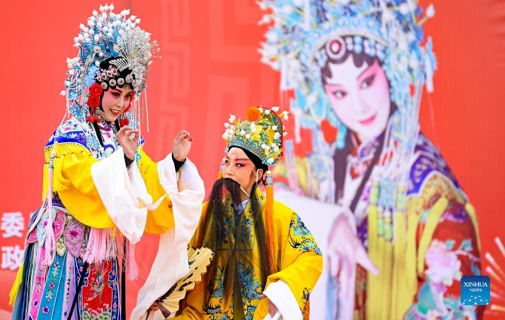 Artists perform traditional opera to celebrate the Lantern Festival in Saihan District of Hohhot, north China's Inner Mongolia Autonomous Region, Feb. 14, 2022. The Lantern Festival, the 15th day of the first month of the Chinese lunar calendar, falls on Feb. 15 this year. (Photo by Wang Zheng/Xinhua)