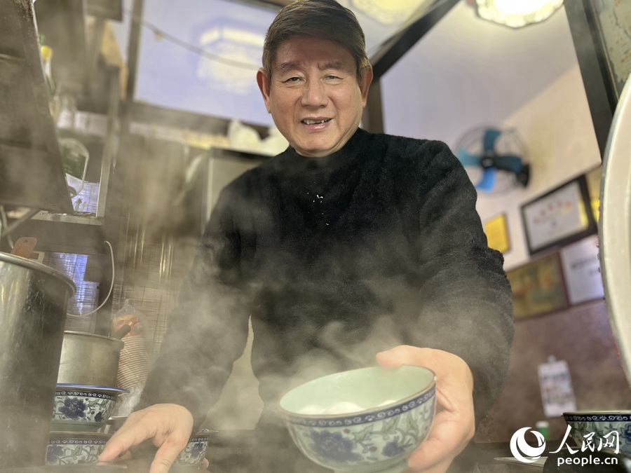 Lin Yingde makes glutinous rice balls in his restaurant in Fuzhou city, southeast China’s Fujian Province. (People’s Daily Online/Qian Jiahe)