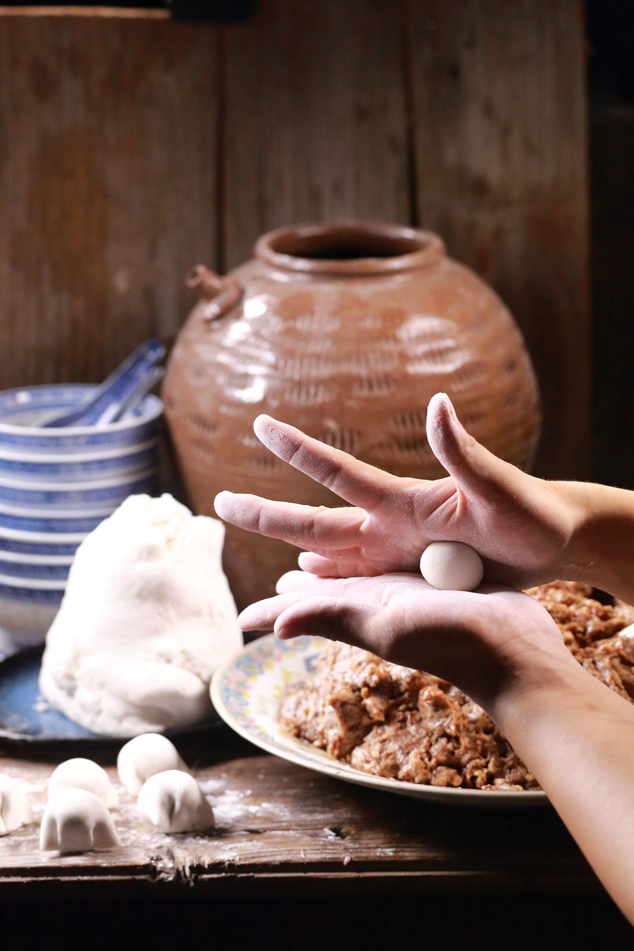 Lin Yingde makes meat stuffing for his restaurant’s special glutinous rice balls. (Photo/Lin Wei)