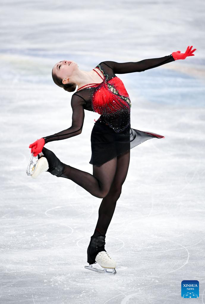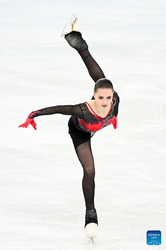 Kamila Valieva of ROC performs during the figure skating women single skating free skating of the Beijing 2022 Winter Olympics at Capital Indoor Stadium in Beijing, capital of China, Feb. 17, 2022. (Xinhua/Li Ziheng)