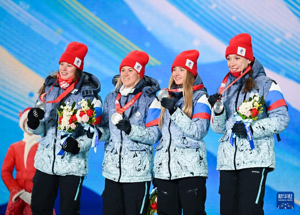 Silver medalits of ROC pose during the awarding ceremony of biathlon women's 4x6km relay at Zhangjiakou Medals Plaza of the Winter Olympics in Zhangjiakou, north China's Hebei Province, Feb. 17, 2022. (Xinhua/Mu Yu)