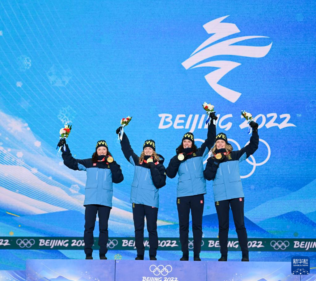 Gold medalists of Sweden pose during the awarding ceremony of biathlon women's 4x6km relay at Zhangjiakou Medals Plaza of the Winter Olympics in Zhangjiakou, north China's Hebei Province, Feb. 17, 2022. (Xinhua/Mu Yu)