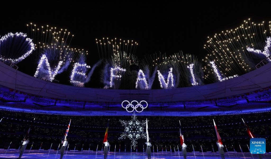 Fireworks illuminate the night sky during the closing ceremony of the Beijing 2022 Olympic Winter Games at the National Stadium in Beijing, capital of China, Feb. 20, 2022. (Xinhua/Li Ga)