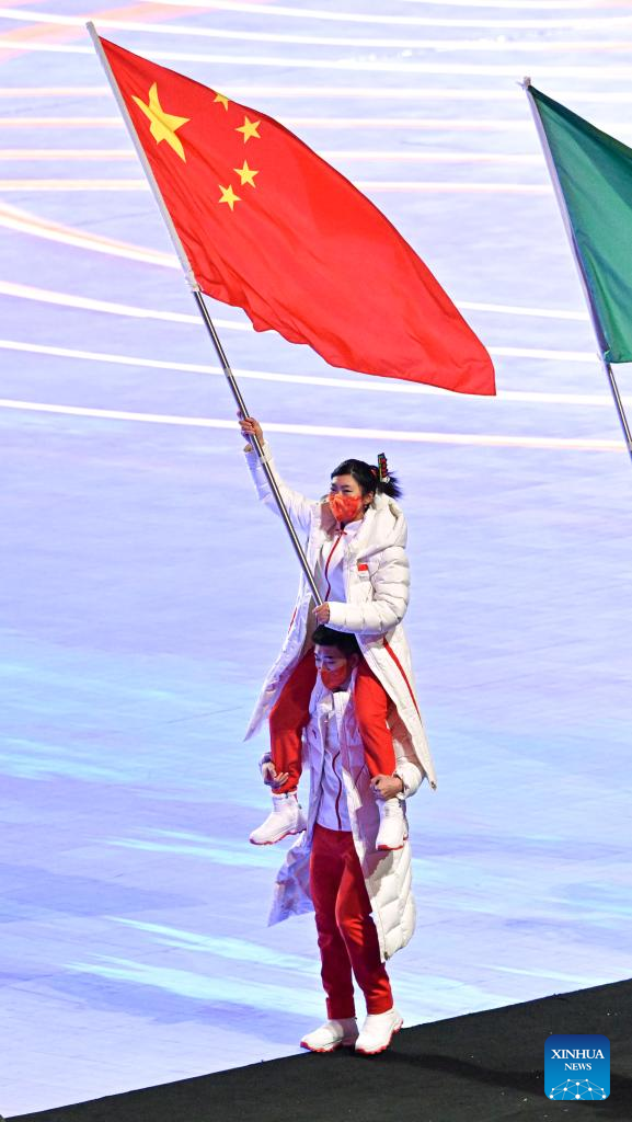 Xu Mengtao (top) and Gao Tingyu, flag bearers of the Olympic delegation of the People's Republic of China parade during the closing ceremony of the 24th Olympic Winter Games at the National Stadium in Beijing, capital of China, Feb. 20, 2022. (Xinhua/Du Yu)