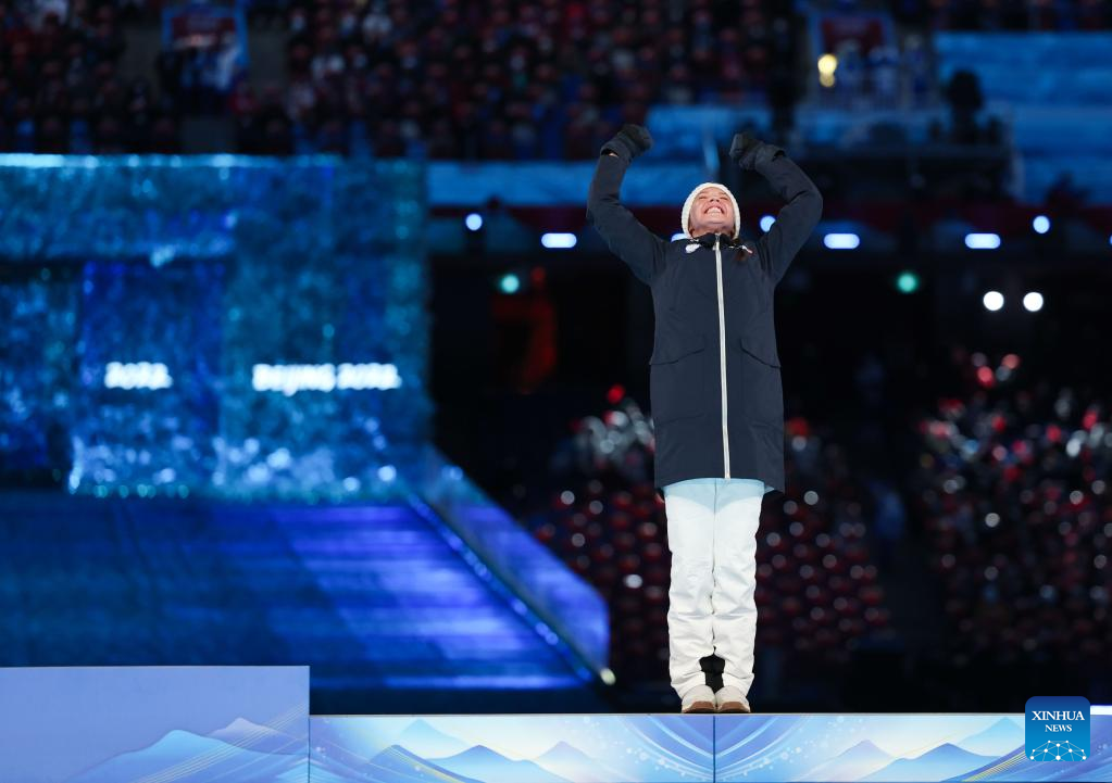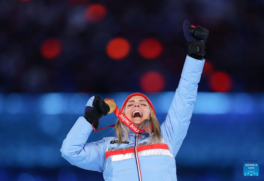 Gold medalist Therese Johaug of Norway reacts during the Victory Ceremony of the cross-country skiing women's 30km mass start free event during the closing ceremony of the Beijing 2022 Olympic Winter Games at the National Stadium in Beijing, capital of China, Feb. 20, 2022. (Xinhua/Cao Can)