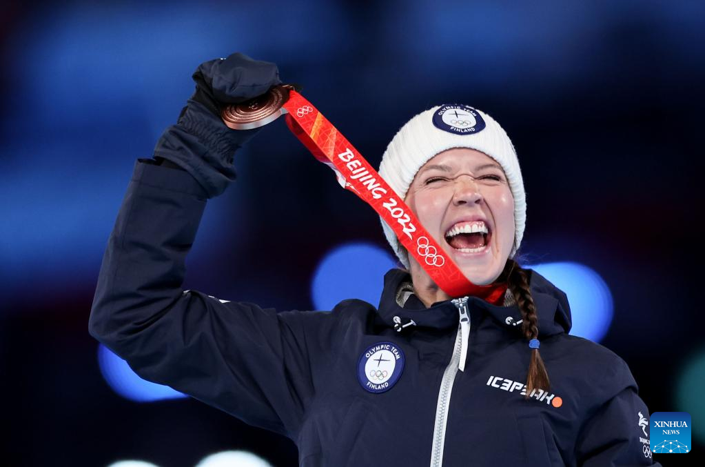 Bronze medalist Kerttu Niskanen of Finland reacts during the Victory Ceremony of the cross-country skiing women's 30km mass start free event during the closing ceremony of the Beijing 2022 Olympic Winter Games at the National Stadium in Beijing, capital of China, Feb. 20, 2022. (Xinhua/Cao Can)