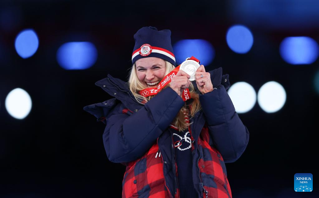 Silver medalist Jessie Diggins of the United States reacts during the Victory Ceremony of the cross-country skiing women's 30km mass start free event during the closing ceremony of the Beijing 2022 Olympic Winter Games at the National Stadium in Beijing, capital of China, Feb. 20, 2022. (Xinhua/Cao Can)