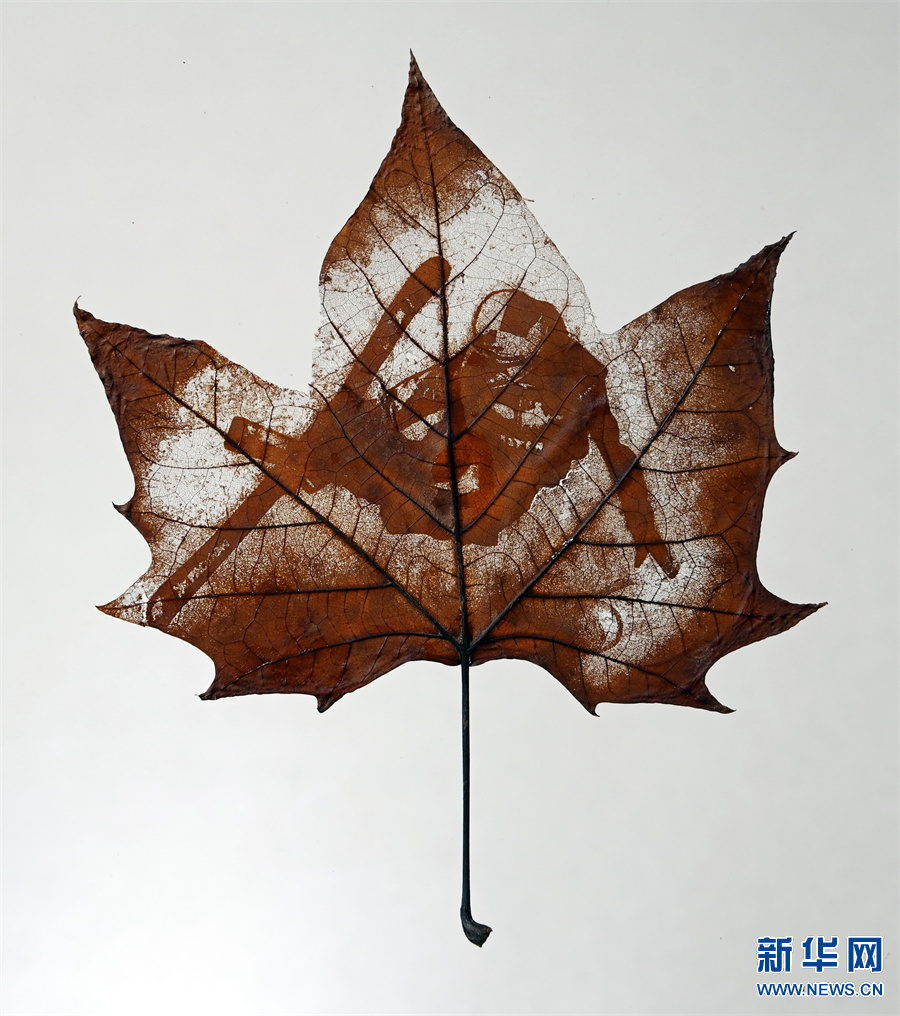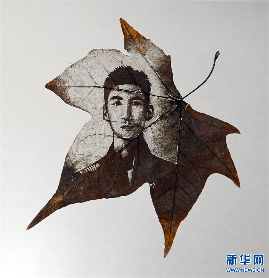 Photo shows Chen Liming’s leaf carving work with an image of Chinese speed skater Wu Dajing. (Photo/Yang Fan)