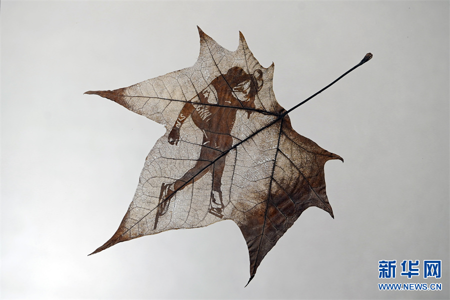 Photo shows Chen Liming’s leaf carving work with an image of a speed skater. (Photo/Yang Fan)