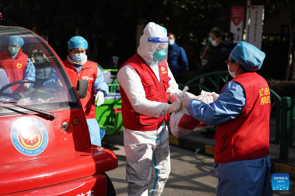 A volunteer takes vegetable packages from a staff member at Suzhou Industrial Park in Suzhou, east China's Jiangsu Province, Feb. 20, 2022. A number of large supermarkets at Suzhou Industrial Park have been mobilized to provide vegetable packages for residents in quarantine to meet their daily needs since the recent resurgence of COVID-19 cases in the city. (Xinhua/Ji Chunpeng)