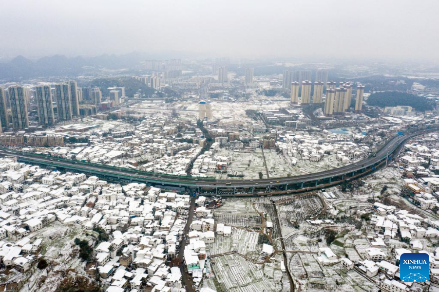 Aerial photo taken on Feb. 22, 2022 shows the snow scenery of an economic and technological development zone in Guiyang City, southwest China's Guizhou Province.