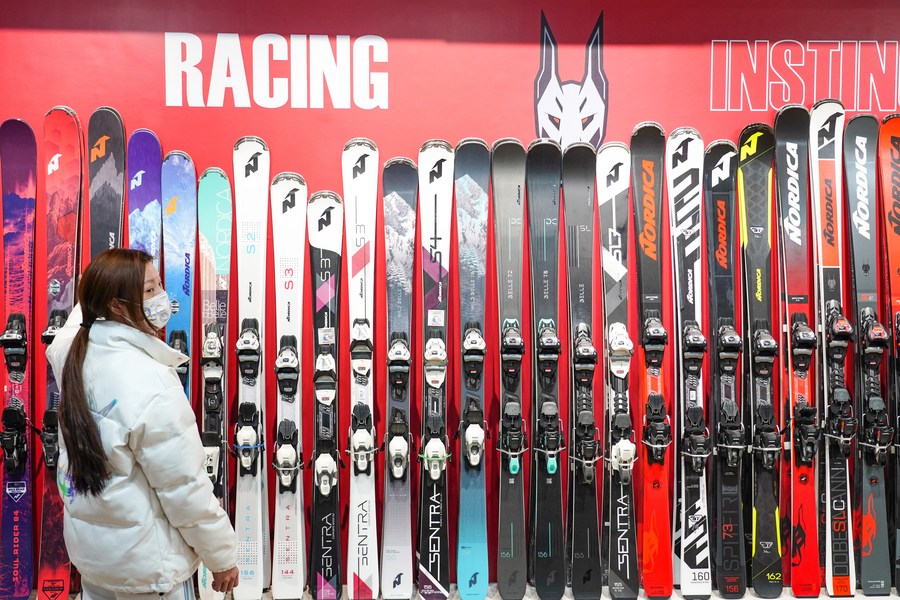 A staff member arranges skis at sports brand Nordica store in Beijing, capital of China, Jan. 6, 2022.(Xinhua/Chen Zhonghao)