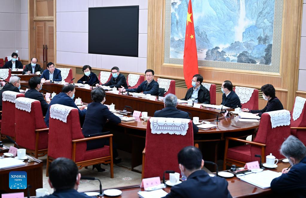 Chinese Vice Premier Han Zheng, also a member of the Standing Committee of the Political Bureau of the Communist Party of China Central Committee, speaks while chairing a meeting on the inspection of environmental protection efforts in Beijing, capital of China, Feb. 22, 2022. (Xinhua/Zhang Ling)
