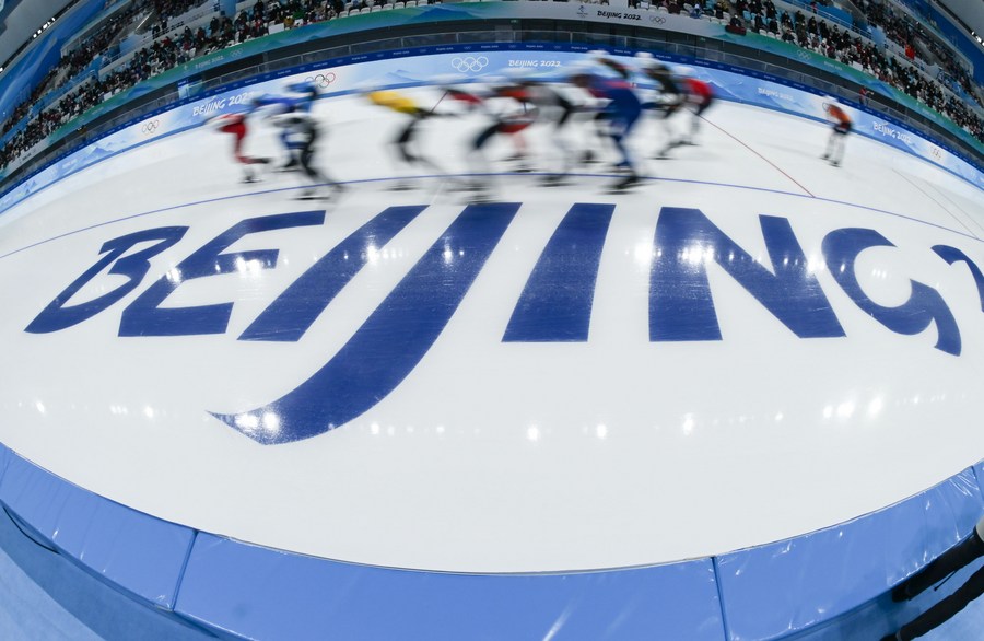 Athletes compete during speed skating men's mass start semifinals of Beijing 2022 Winter Olympics at the National Speed Skating Oval in Beijing, capital of China, Feb. 19, 2022. (Xinhua/Wu Wei)