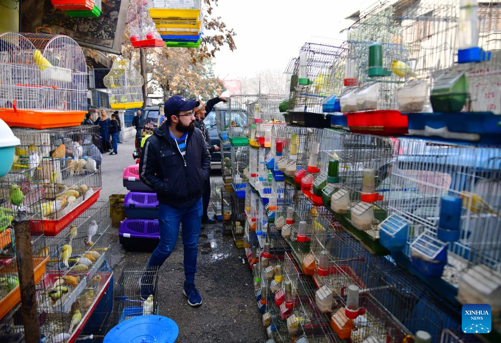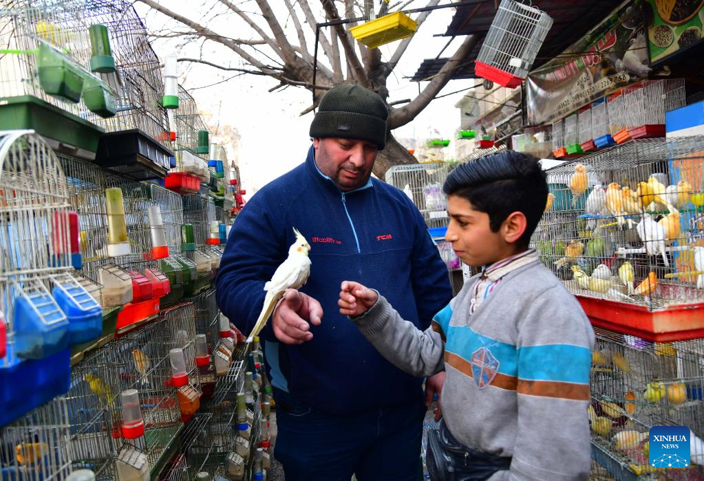 Pet birds are sold at a market in Damascus, Syria, Feb. 22, 2022. (Photo by Ammar Safarjalani/Xinhua)