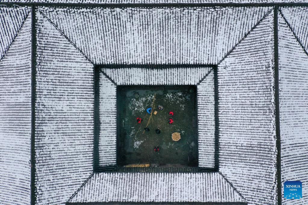 Aerial photo taken on Feb. 23, 2022 shows the snow view of Maohuo Village in Haishu District of Ningbo, east China's Zhejiang Province. (Photo by Hu Xuejun/Xinhua)