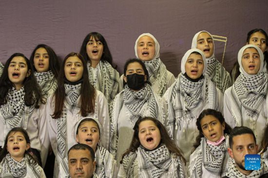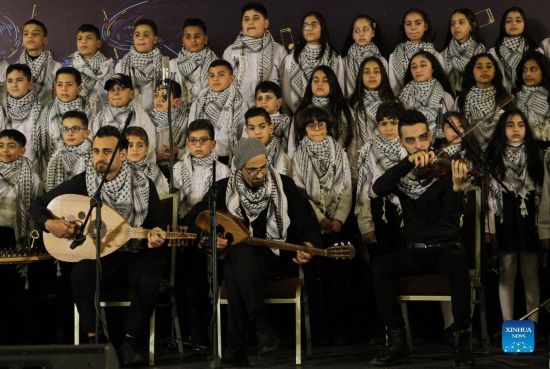 Palestinian children participate in a concert "Enjoy Your Life with Music" in Gaza City, on Feb. 26, 2022. (Photo by Rizek Abdeljawad/Xinhua)