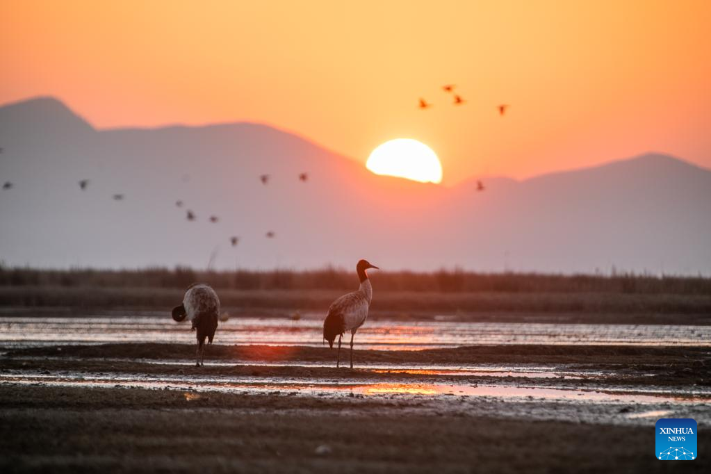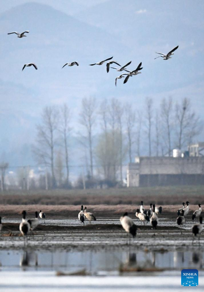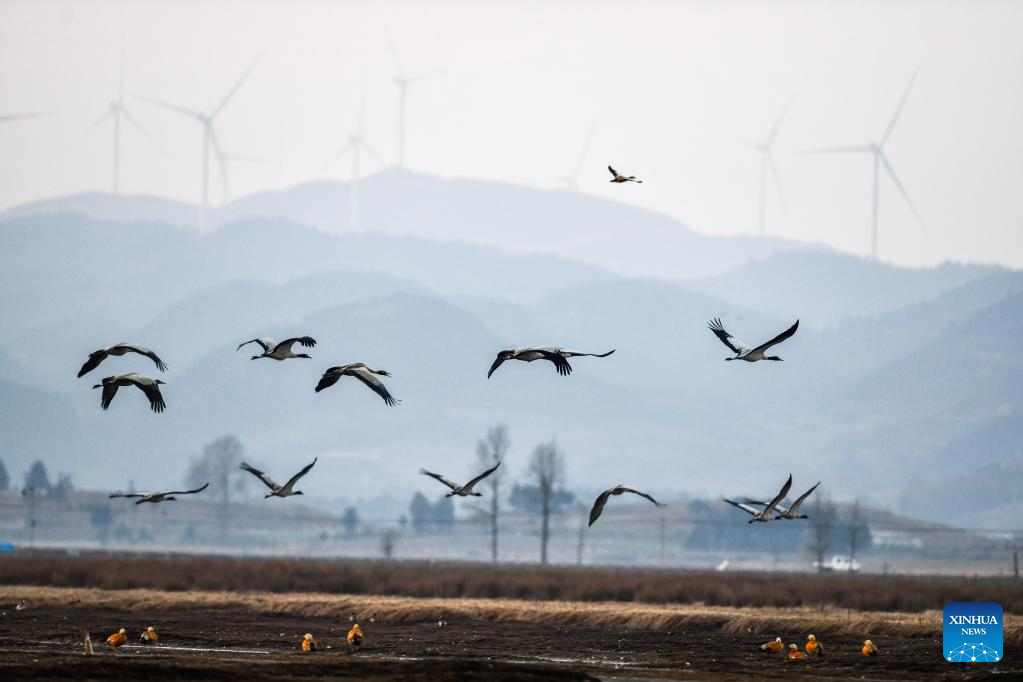 Black-necked cranes and other migrant birds are seen at the Caohai National Nature Reserve in Weining Yi, Hui and Miao Autonomous County, southwest China's Guizhou Province, March 8, 2022. (Xinhua/Yang Wenbin)