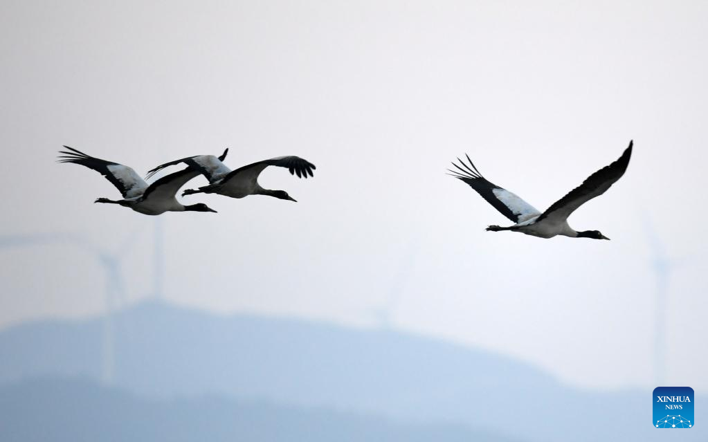 Black-necked cranes are seen at the Caohai National Nature Reserve in Weining Yi, Hui and Miao Autonomous County, southwest China's Guizhou Province, March 8, 2022. (Xinhua/Yang Wenbin)