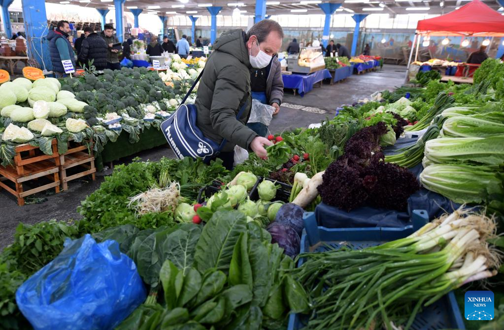 A customer selects vegetables at a market in Istanbul, Turkey, March 3, 2022. Turkey's annual inflation surged to a two-decade high of 54.44 percent in February, and the Turkish lira has lost roughly 60 percent of its value against the U.S. dollar since 2021. (Xinhua/Shadati)