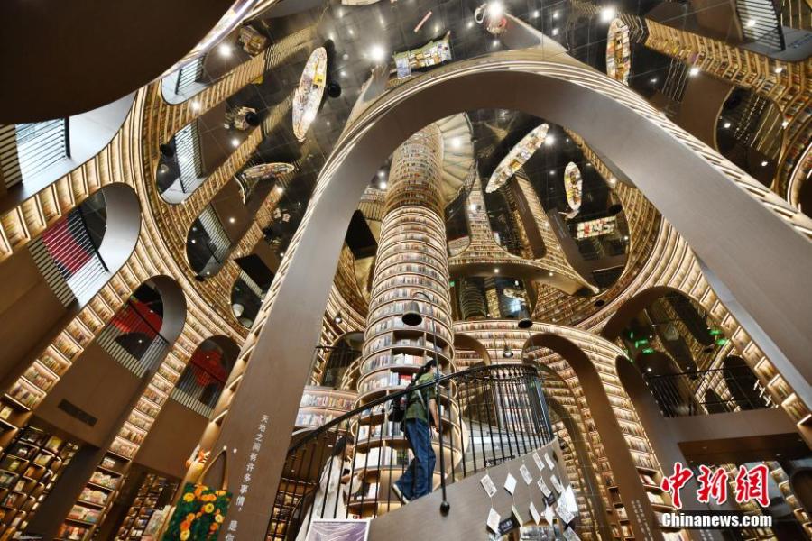 Photo shows the interior of Zhongshuge bookstore in Dujiangyan, southwest China's Sichuan Province, March 15, 2022. Dujiangyan Zhongshuge relies on strategically placed mirrors and gleaming black tile floor to create a stunning illusion that makes the place look like an endless bookworm’s paradise. The entity won the professional judges award on the 2021 A+ Awards and has been attracting visitors with its unique design. (Photo: China News Service/Zhang Lang)