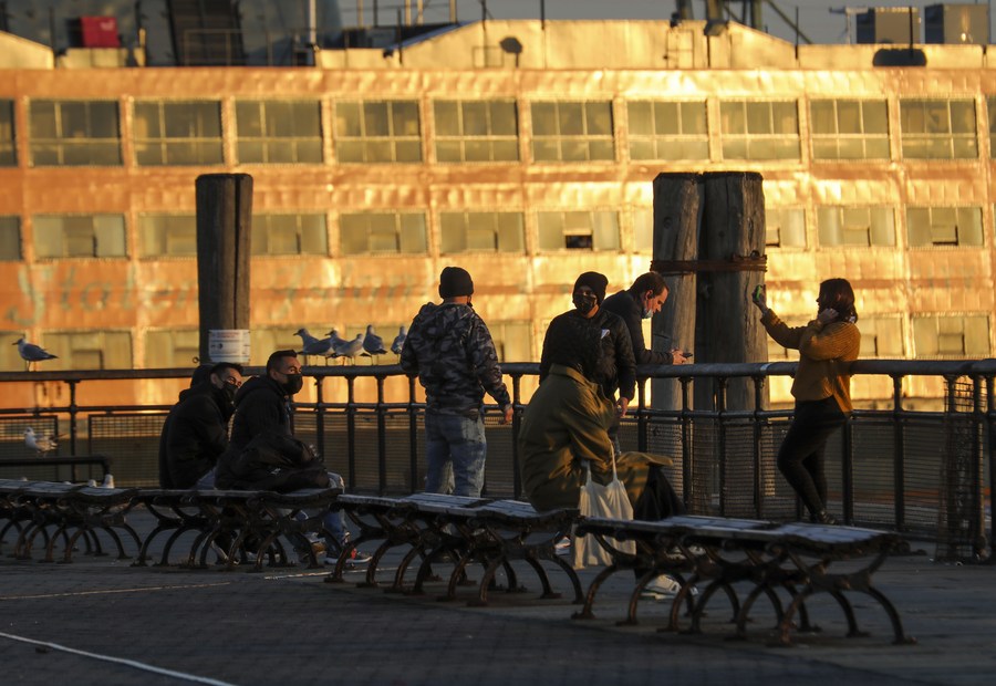 People enjoy sunset at the seaside in Manhattan of New York, the United States, Jan. 19, 2022. (Xinhua/Wang Ying)