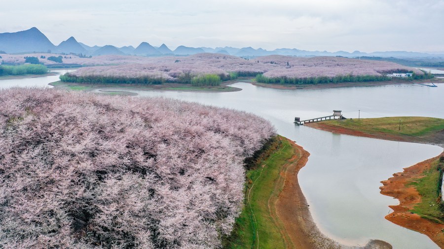 Aerial photo taken on March 17, 2022 shows blooming cherry blossoms at a cherry garden in Gui'an New Area of Guiyang, southwest China's Guizhou Province. (Xinhua/Ou Dongqu)
