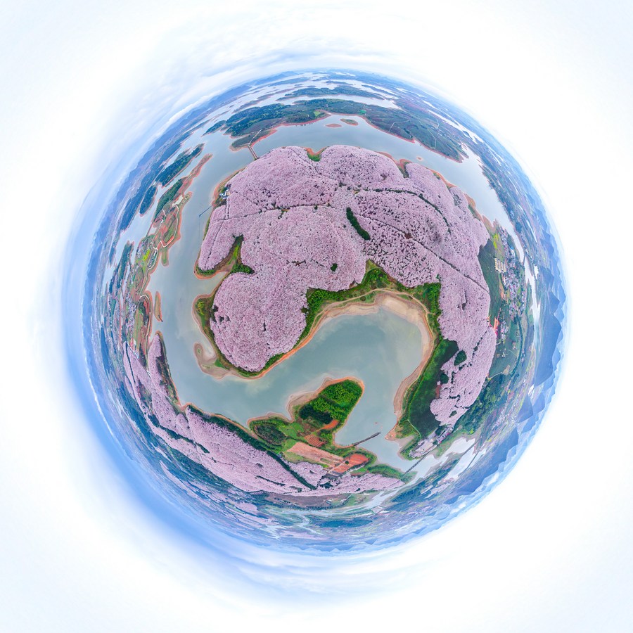 Aerial panoramic photo taken on March 17, 2022 shows blooming cherry blossoms at Gui'an New Area in Guiyang, southwest China's Guizhou Province. (Xinhua/Ou Dongqu)