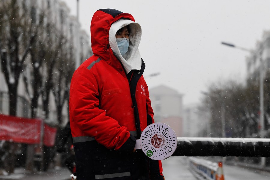 A volunteer is on duty amid snow in Shacheng Town of Huailai County, north China's Hebei Province, March 17, 2022. (Photo by Sun Huijun/Xinhua)