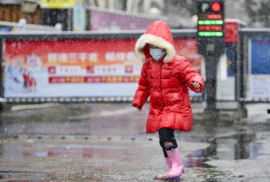A child walks in snow in Hohhot, north China's Inner Mongolia Autonomous Region, March 17, 2022. (Photo by Wang Zheng/Xinhua)