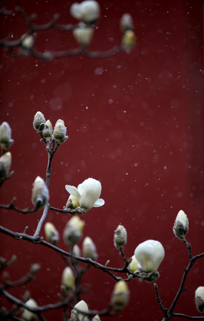 A blooming magnolia tree is seen amid snow in Mentougou District of Beijing, capital of China, March 17, 2022. (Photo by Hou Jiqing/Xinhua)