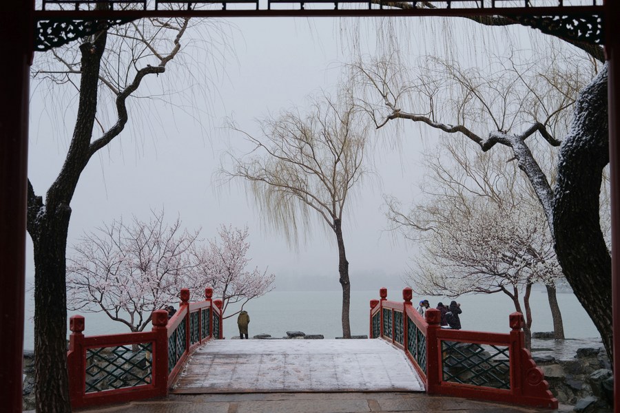 Tourists visit the Summer Palace amid snow in Beijing, capital of China, March 17, 2022. (Photo by Guo Junfeng/Xinhua)
